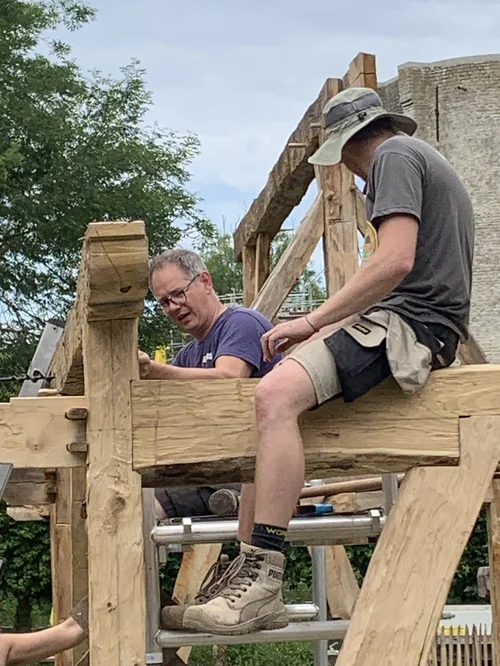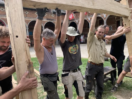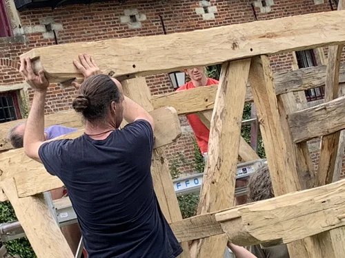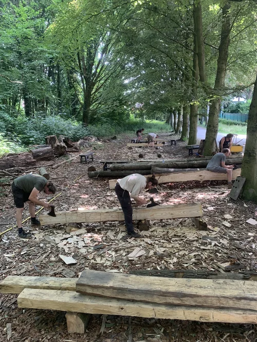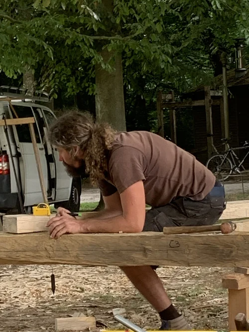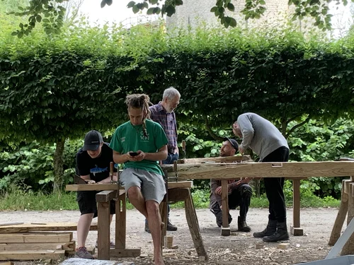 At the Museum of Old Techniques together with Mathijs Huyghebaert (Matisu.be). First workshop “vakwerk”. Building a bee shelter with 18 students in 3 weeks from round logs to finished building using only handtools.